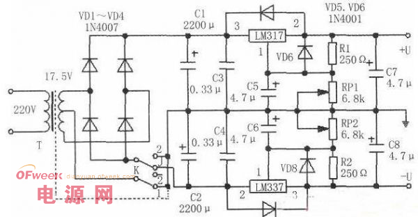 電路工作原理見下圖。本電路最大的優點是采用兩塊三端可調穩壓塊LM317、LM337。在維修使用過程中,當開關K撥至位置“1”時,由電源變壓器T次級降至17.5V×2的交流電壓,經VD1~VD4整流后分別送到LM317和LM337的輸入端,再經取樣電阻R1、R2和輸出電壓調解電位器RPl、RP2的控制,就可以在輸出端得到±1.25~15V連續可調的電壓。當選擇開關K位置撥在“2”時,就將雙組輸出的電源變壓器T組作為單組使用,經整流、濾波后只送入LM317,以得到+1.25~30V電壓。單電源輸出,這樣就可以方便地應用于需要單電源或略高的電壓在維修電路中選用。